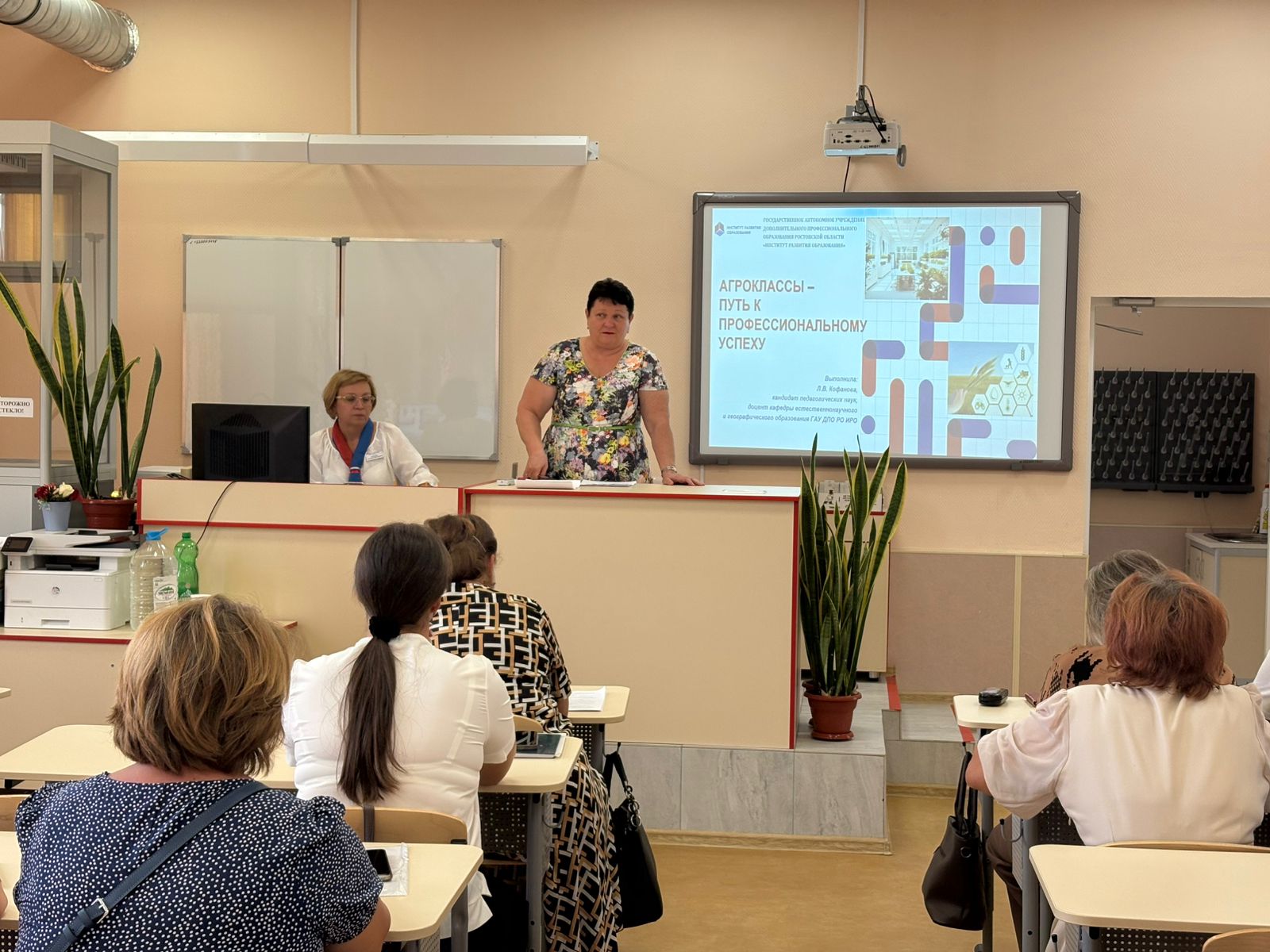 Людмила Владимировна представила опыт внедрения агроклассов не только в других регионах, но и в нашей Ростовской области, Данные агроклассы способствуют популяризация сельскохозяйственных профессий, развитие системы непрерывного аграрного образования в ходе обмена лучшими практиками организации и развития сети агрошкол и агроклассов. Людмила Владимировна затронула важные аспекты, такие как: изменения нормативной базы в сфере образования, рассказала об утвержденном перечне проверяемых требований к метапредметным результатам освоения ООП и др. Для учителей нашего района было очень интересно узнать, что уже открыто 17 агроклассов и в РО разработана региональная система развития естественно-научного образования.
